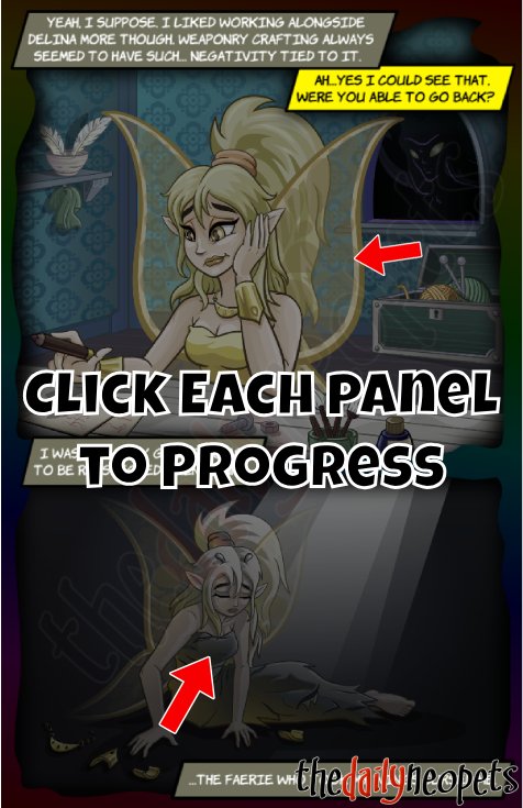 Baelia and Luxinia have made it back to their friends, who were waiting in the same spot they were left in. Instead of Luxinia using her magic to light their way, Baelia informs her friends she can craft a new lantern. We learn that Baelia used to work under Delina, the Crafting Faerie, before she lost her wings. You can read all the plot dialogue here.