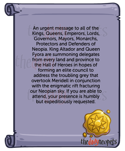 King Altador and Queen Fyora have summoned everyone to the Hall of Heroes to discuss putting a stop to this mysterious grey that is overtaking Neopia.
